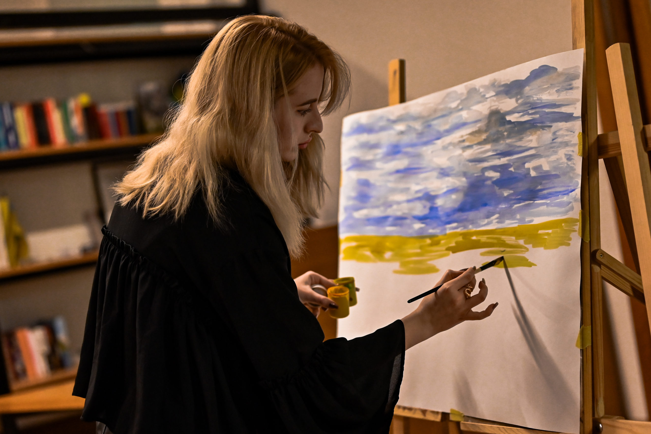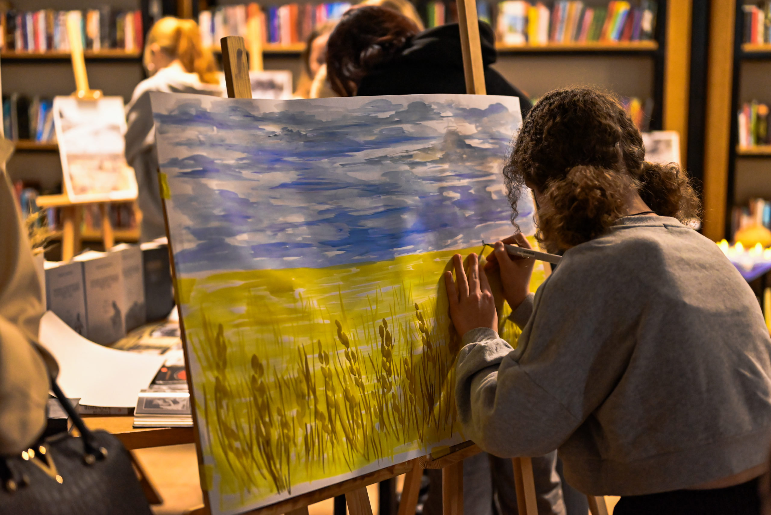 Наприкінці заходу художниця Світлана Черкавська організувала інтерактив – вона зобразила один із символів нашої незалежності – синьо-жовтий стяг, на якому усі бажаючі написали побажання для України.