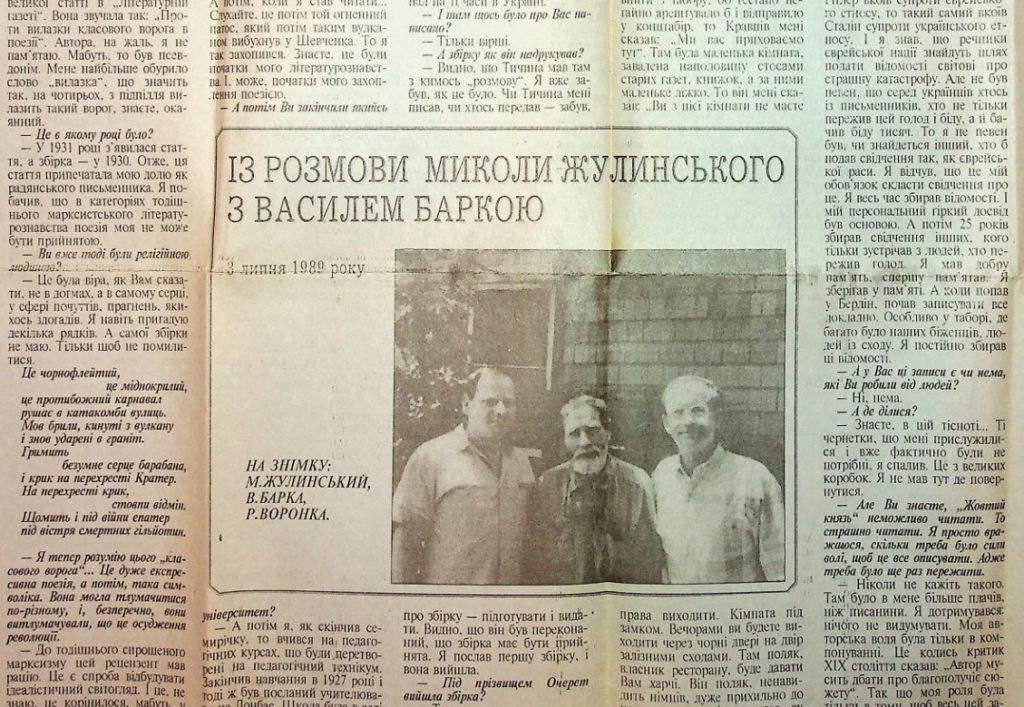 20 серпня 1998 року в газеті «Літературна Україна» вийшло інтерв’ю академіка НАН України Миколи Жулинського з письменником і філософом Василем Баркою. Розмова була записана 3 липня 1989 року під час поїздки пана Жулинського до США. Зустріч відбулася в містечку Глен Спей, що за кілька годин їзди автомобілем від Нью-Йорка. Найцікавіше з тієї розмови Микола Жулинський опублікував майже через 10 років з нагоди 90-річчя письменника. Ми знайшли це інтерв’ю, одне з небагатьох, що виходило в українській пресі, оцифрували та пропонуємо вашій увазі (стилістику оригіналу збережено). В розмові письменник згадує, як і де пережив Голодомор та як з’явився його твір «Жовтий князь».